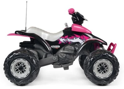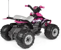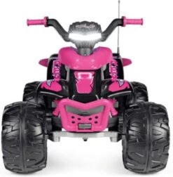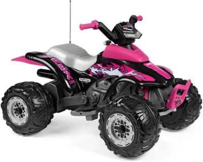 Volle Fahrt voraus heißt es bei diesem coolen Quad von Peg Perego. Das coole Gefährt eignet sich hervorragend, für Kids, die gerne draußen ihren Spaß haben. Dank der großen Räder und des hohen Sitzes geht es bequem auf sichere Fahrt durch das Gelände. Egal ob über Wiesen oder durch den Matsch. Mit Stoßstange und Schmutzfängern und hinterem Kotflügel ist das Produkt bestens ausgestattet für fast jeden Untergrund. Die Griffe sind mit einer rutschfesten Beschichtung versehen und sorgen so für optimalen Halt. Dank des coolen Designs in Schwarz und Pink sieht das Quad außerdem echt cool aus und beeindruckt in ganzer Linie.