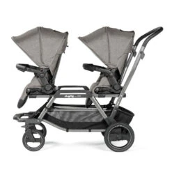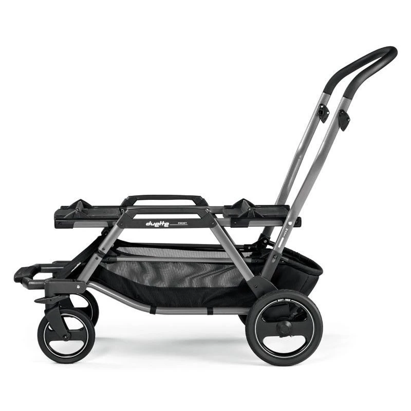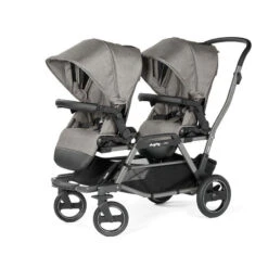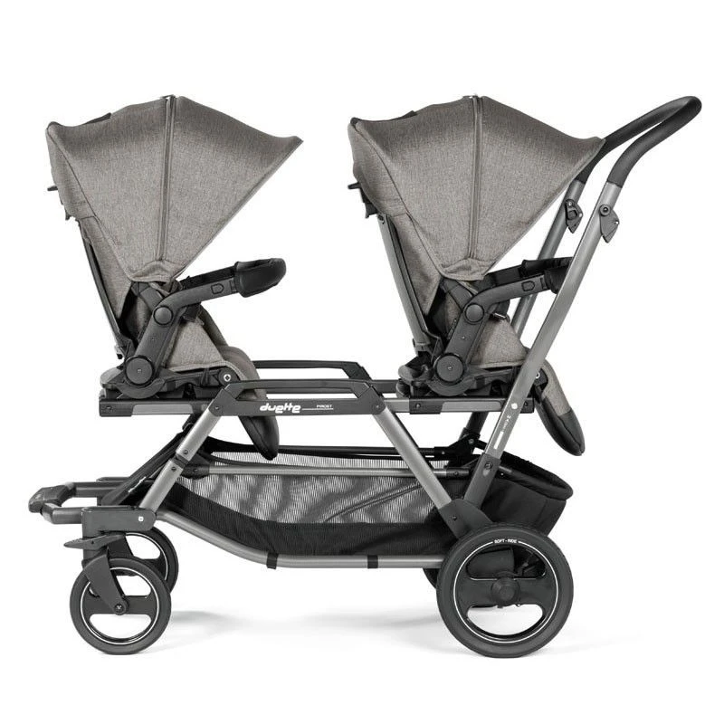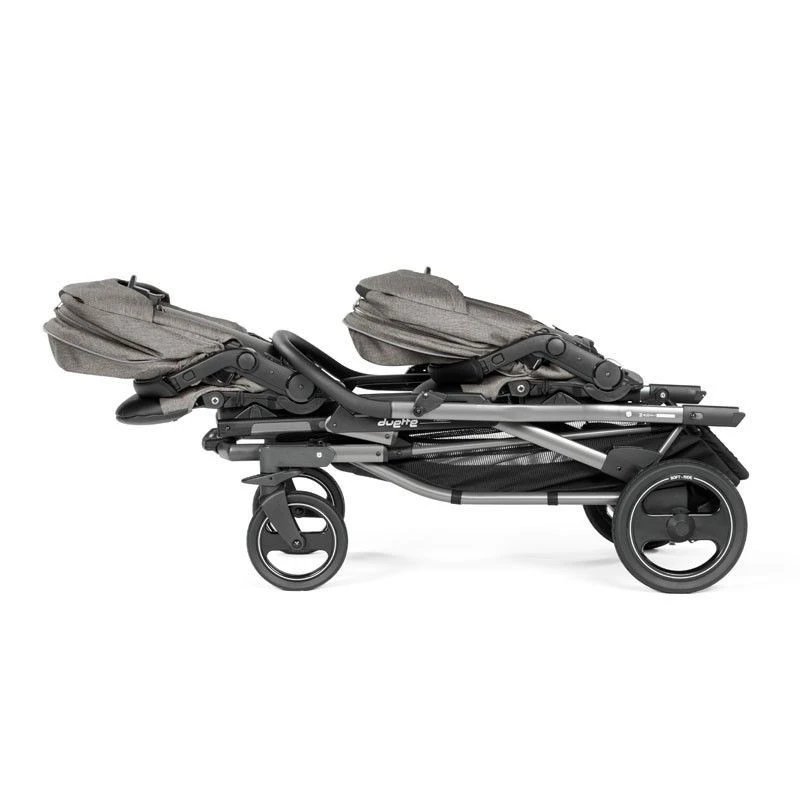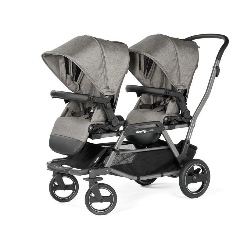· Der wendige Zwillings-/Geschwistersportwagen mit höchstem Fahrkomfort für Babys und Eltern, geeignet ab Geburt bis ca. 36 Monate. Mit seiner geringen Breite von nur 60 cm im Vergleich zu anderen Zwillingswagen kann man auch Engstellen gut passieren. Die Sportwagenaufsätze können mühelos mit nur einem Klick auf dem Gestell befestigt werden, gleich- oder zueinander gerichtet. Die Schwenkbare Räder ermöglichen ein müheloses Steuern des Sportwagens auch bei hohem Gesamtgewicht mit zwei Babys an Board. Die Vorderräder sind bei Bedarf feststellbar, so dass der Wagen auch bei unebenen Straßen und seitlich abfallenden Gehwegen sicher manövriert werden kann. Das Gestell mit Stabbremse und großem Netzkorb ist auch mit den Sportwagensitzen klein zusammenklappbar, die seitlichen Tragegriffe ermöglichen einen guten Transport des Wagens, z.B. bei Treppen. Der Duette bietet sehr viel Fahrkomfort durch 4 große Soft-Ride Luftkammer-Räder (Vorderräder ø 20 cm, Hinterräder ø 27 cm) mit Federung und Kugellagern. Die Räder können abmontiert werden, um den Wagen leichter im Kofferraum verstauen zu können. Durch das praktische Befestigungssystem können mit nur einem Klick die passenden Kinderwagenwannen Navetta Pop-Up und die passenden Babyschalen befestigt werden (Wanne Navetta Pop-Up und Babyschalen jeweils separat erhältlich). Die Sportaufsätze sind mit einem 5-Punkt-Gurt und einem sehr großen erweiterbaren und abnehmbaren Sonnenverdeck ausgestattet. Das Verdeck deckt das Wageninnere auch in Liegeposition komplett ab und schützt das Baby vor Sonne und Wind. Die Frontbügel können zum Ein- und Aussteigen geöffnet oder für Kleinkinder ganz entfernt werden. Die Neigung der Rückenlehnen individuell bis hin zur Liegeposition einstellbar, die Neigung der Fußstützen ist in 2 Positionen verstellbar. Die Bezüge sind abnehmbar und bei maximal 30°C von Hand waschbar.